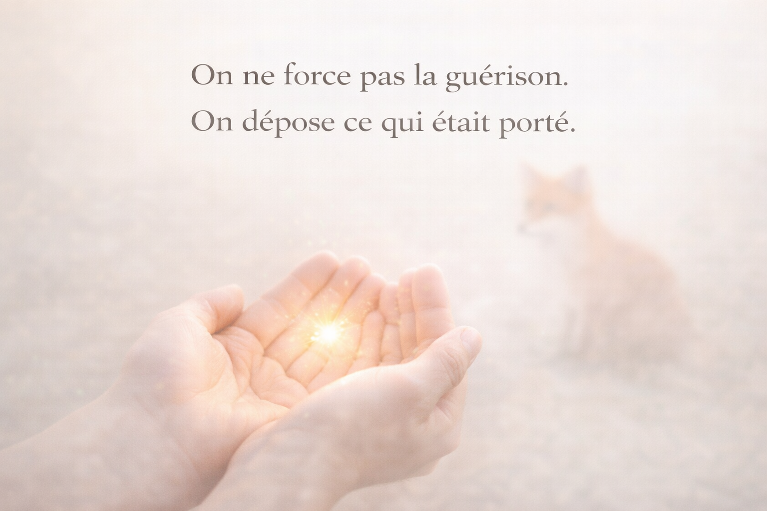 Mains ouvertes recevant une lumière douce, symbole de relâchement et d’amorce de guérison, avec un renard et une luciole discrets évoquant la sécurité intérieure et la permission de recevoir.