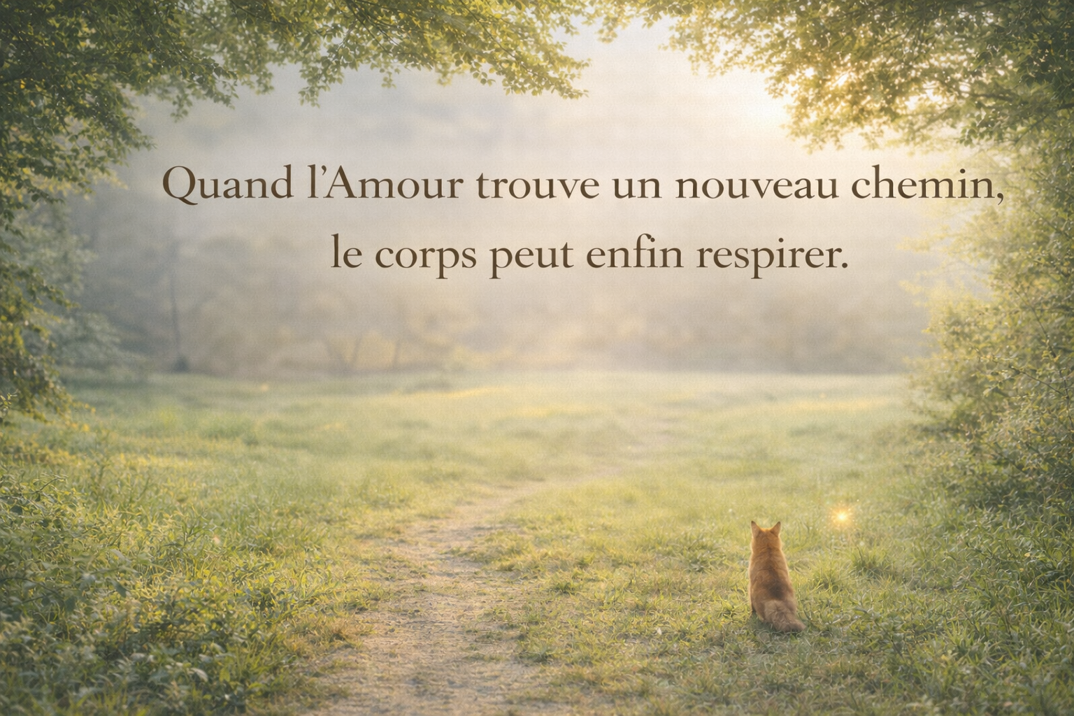 Clairière lumineuse et apaisante en pleine nature, symbole de sécurité et de présence, avec un renard immobile et une luciole discrète, illustrant l’apaisement du corps quand l’amour trouve un nouveau chemin.