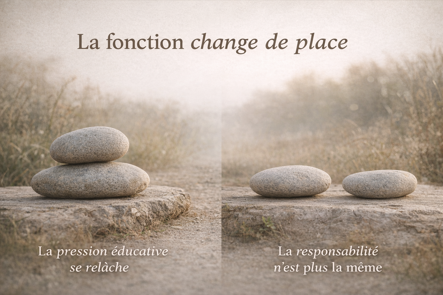 Infographie poétique montrant deux pierres superposées puis séparées, symbolisant le déplacement de la fonction maternelle lorsqu’une femme devient grand-mère, avec un relâchement de la pression éducative et une responsabilité différente.