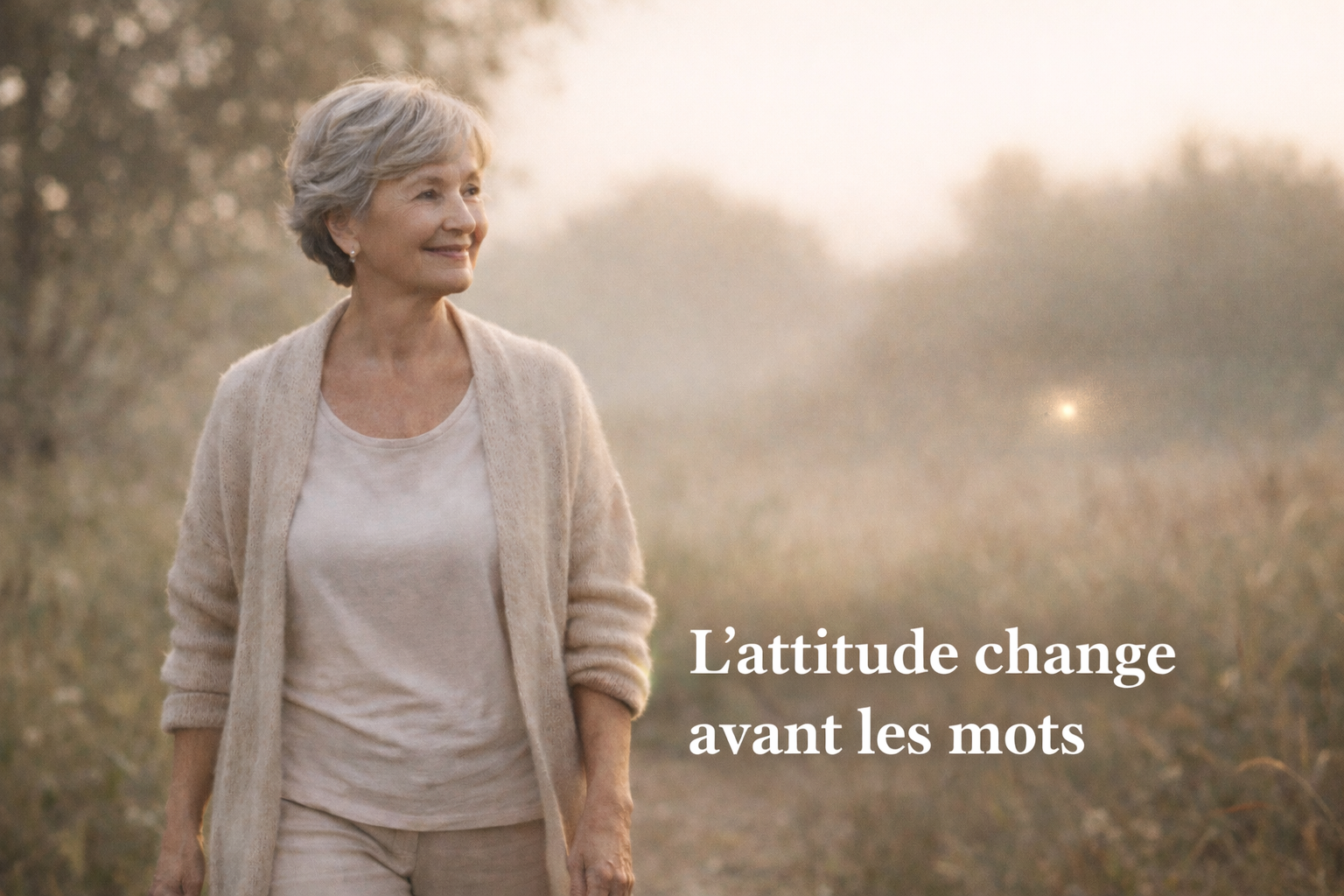 Femme d’une soixantaine d’années, grand-mère moderne, marchant calmement dans la nature à la lumière douce, posture détendue et sourire apaisé, illustrant la transmission de la douceur et la sécurité émotionnelle entre générations.