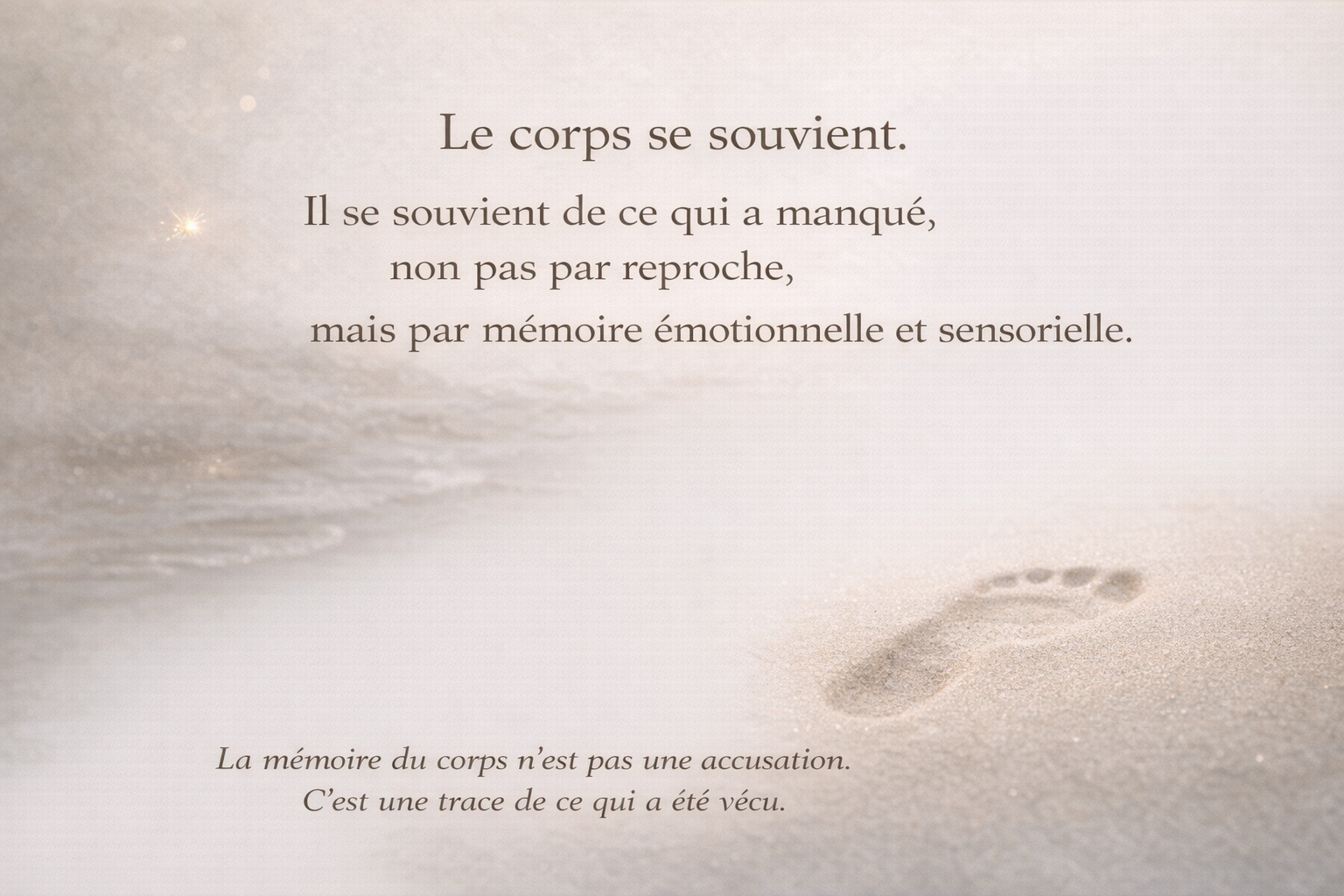 Infographie poétique représentant une empreinte légère dans le sable à la lumière douce, symbolisant la mémoire émotionnelle et sensorielle du corps, avec une luciole discrète évoquant une présence intérieure.