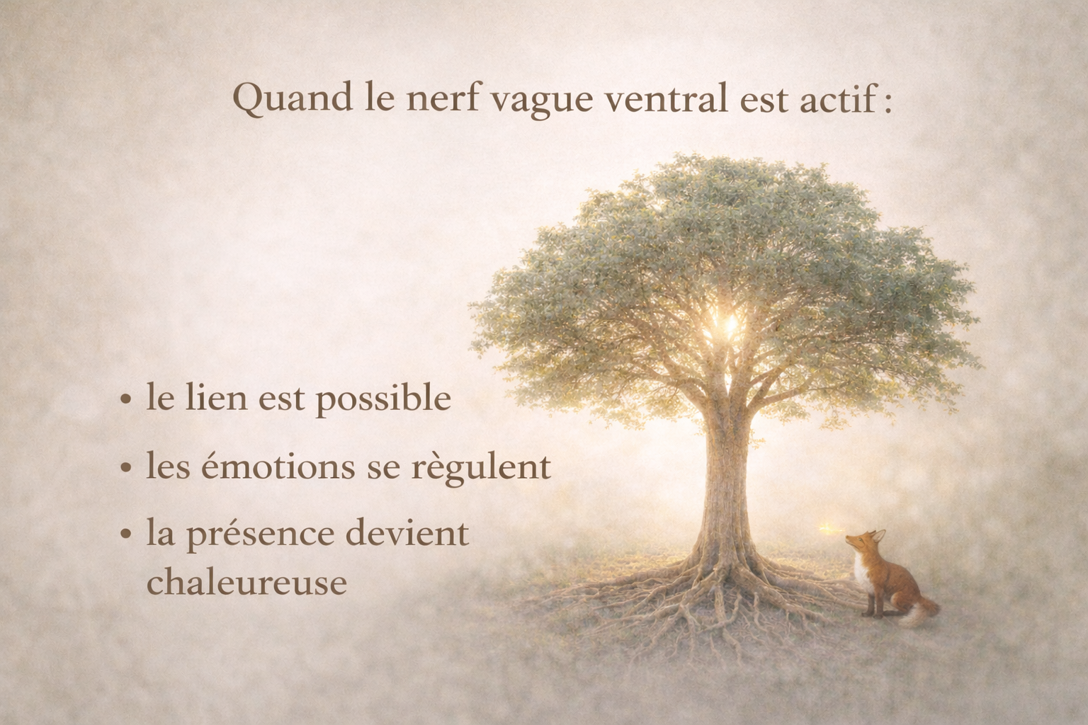 Infographie poétique représentant un arbre lumineux aux racines visibles, symbolisant l’activation du nerf vague ventral, avec un renard et une luciole discrets évoquant le lien, la régulation émotionnelle et une présence chaleureuse.