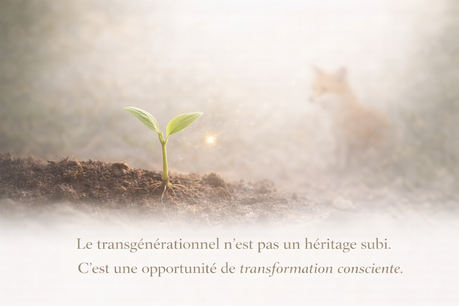 eune pousse verte émergeant d’un sol riche sous une lumière douce, symbolisant le transgénérationnel comme opportunité de transformation consciente, avec un renard et une luciole discrets en arrière-plan.
