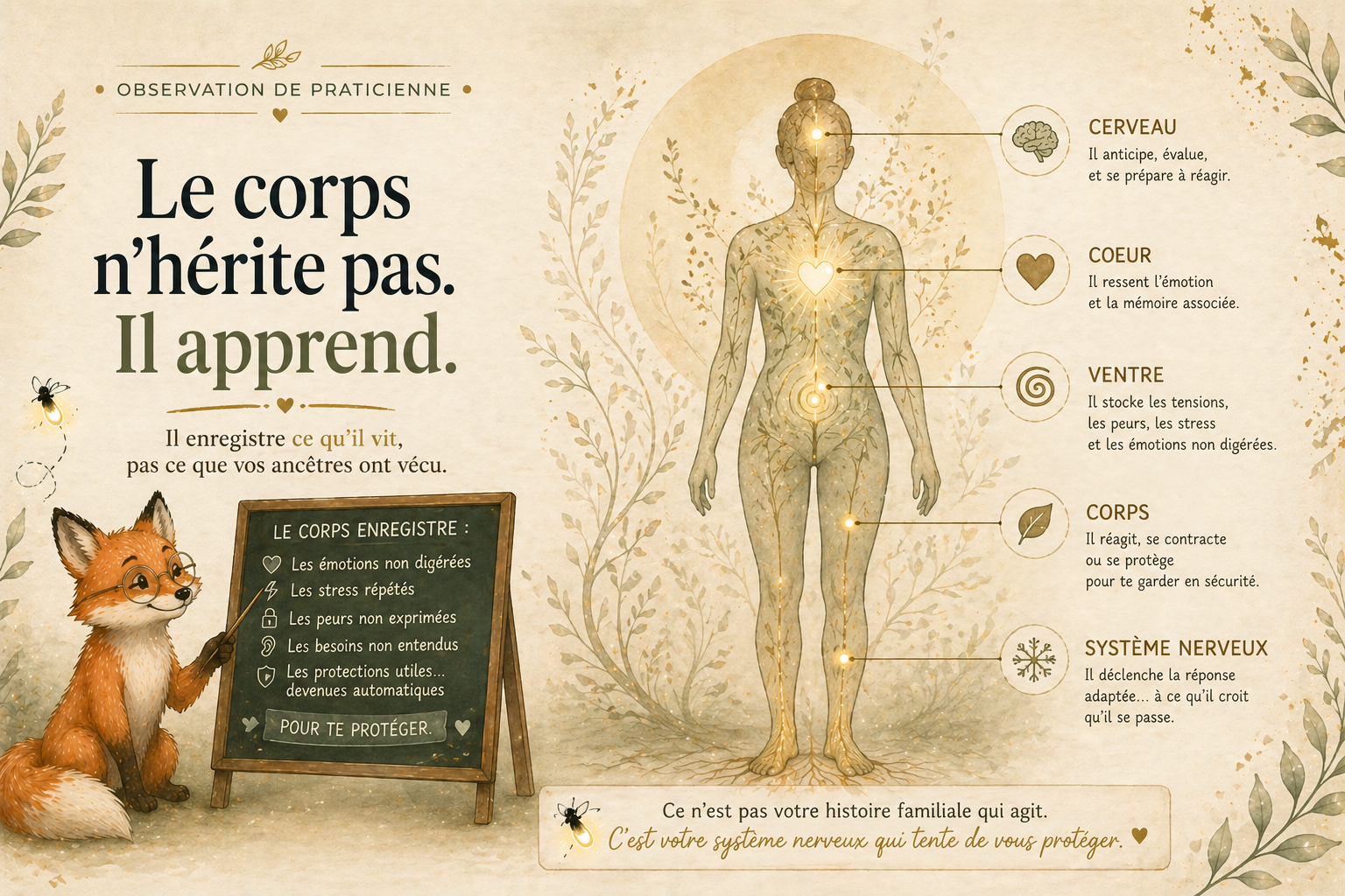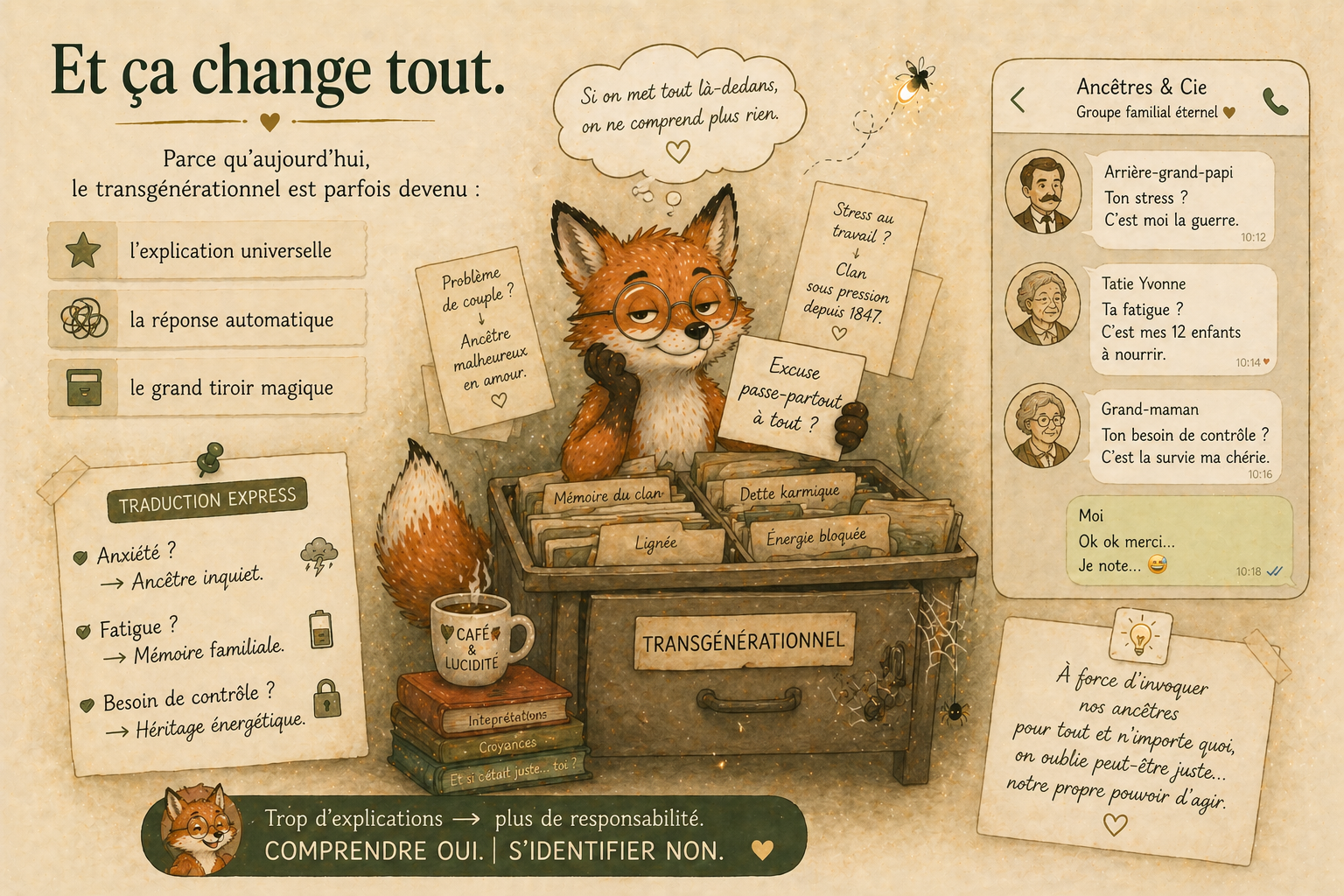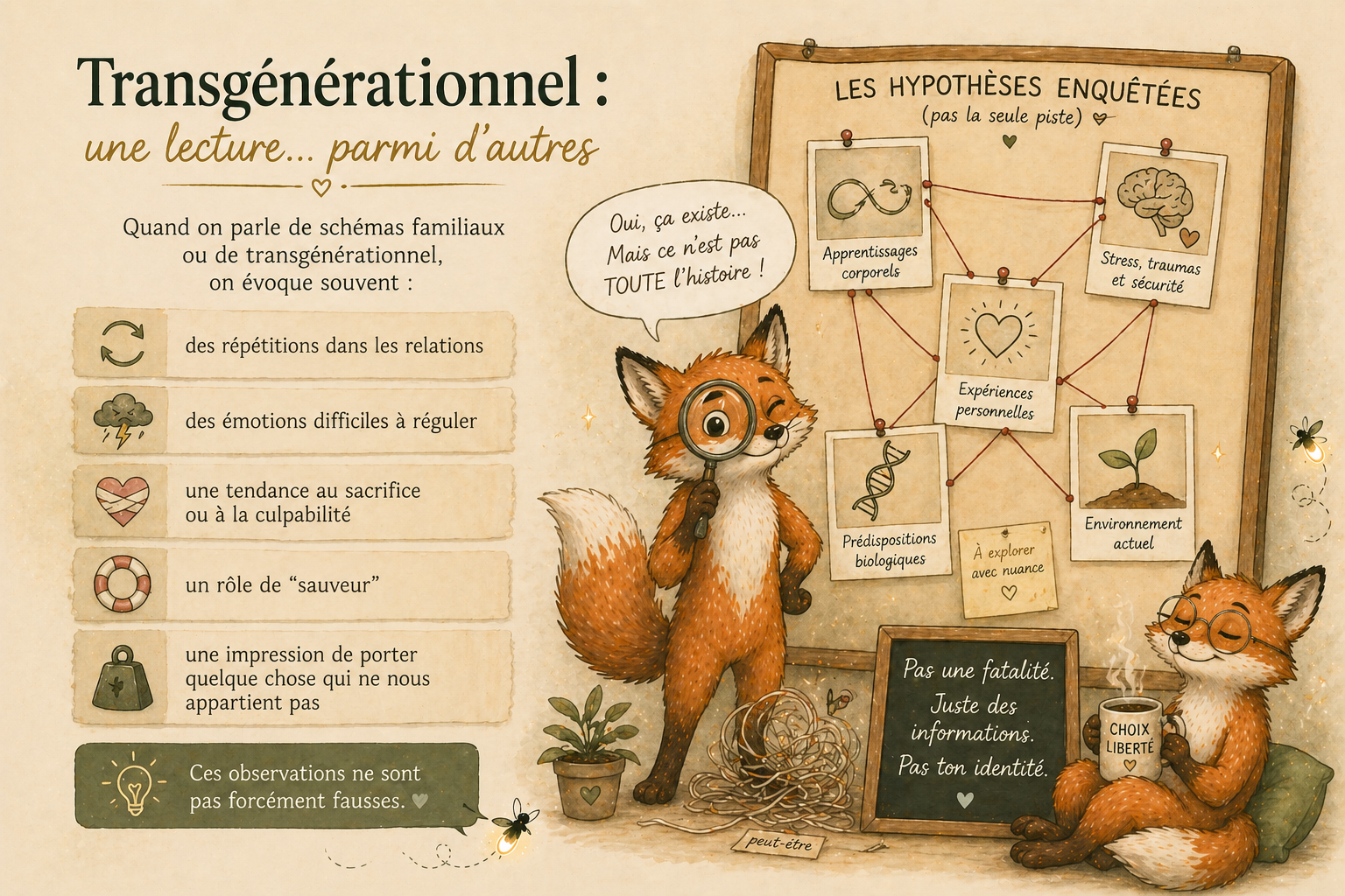 Illustration décryptage du transgénérationnel avec renard pédagogique expliquant que les réactions viennent du système nerveux en alerte plutôt que de la lignée familiale