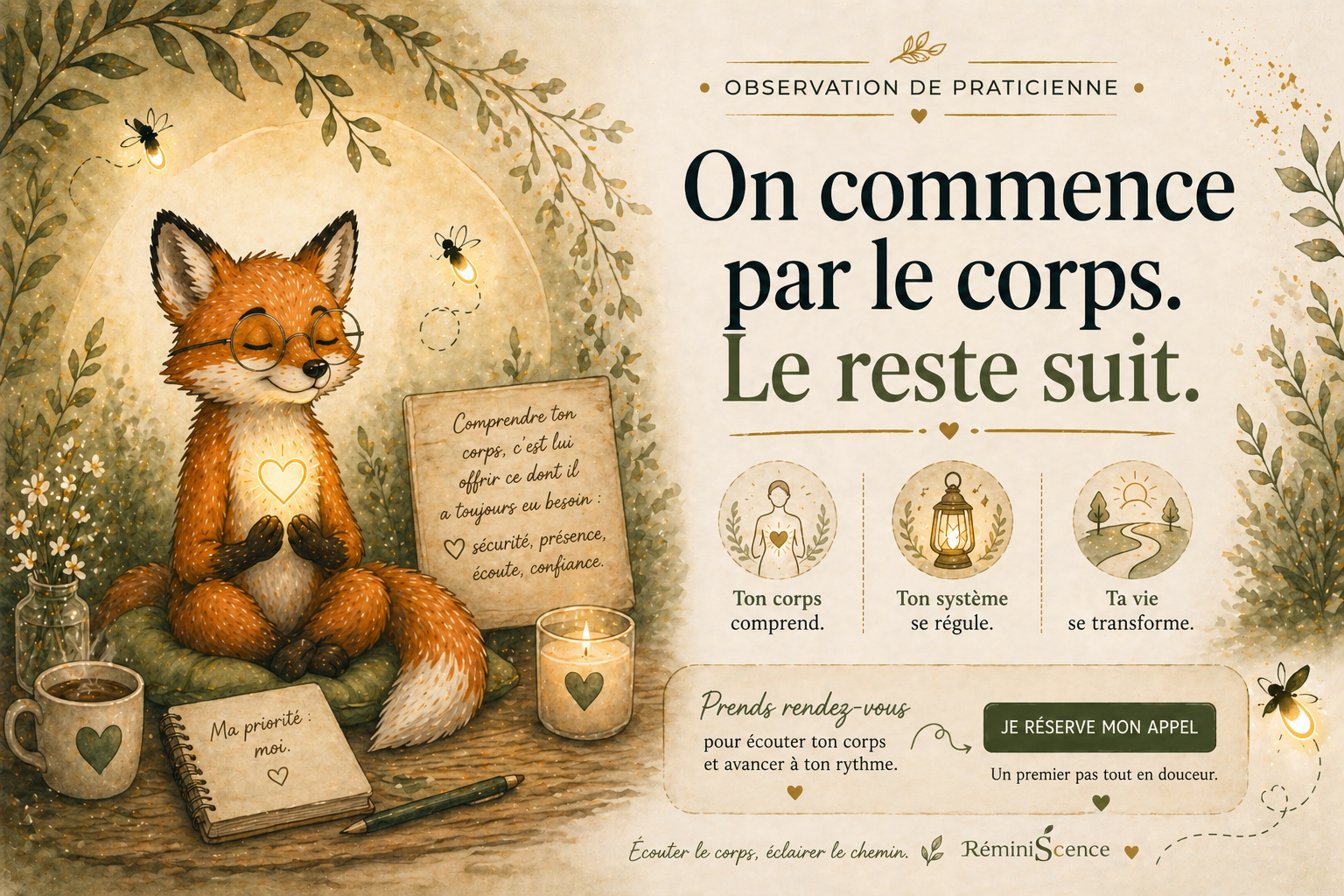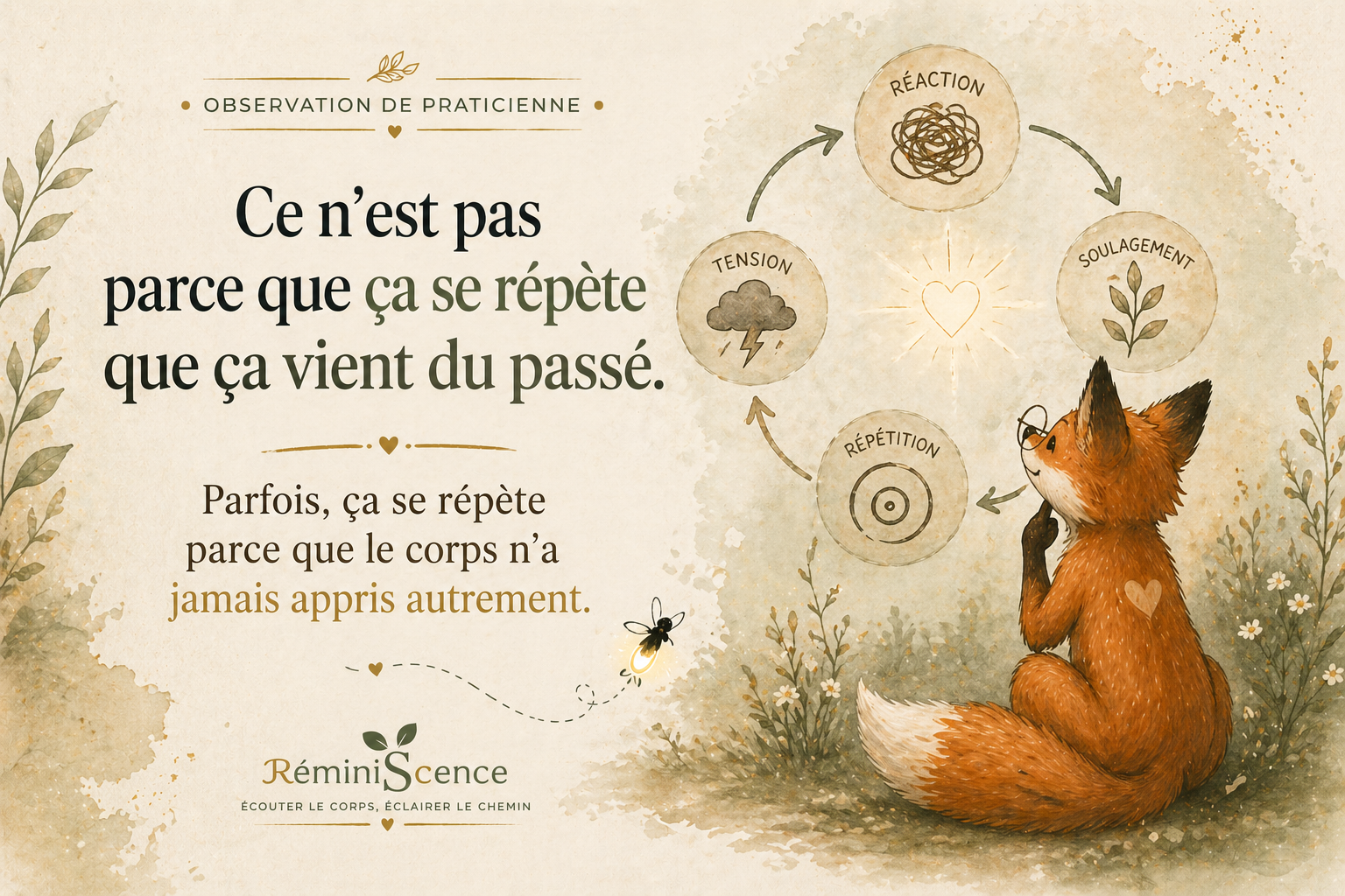 Bandeau illustré RéminiSCence avec renard en mouvement guidé par une luciole, entouré d’éléments végétaux (plantes, fleurs, graines) et d’un livre ouvert symbolisant la compréhension du corps et la régulation du système nerveux