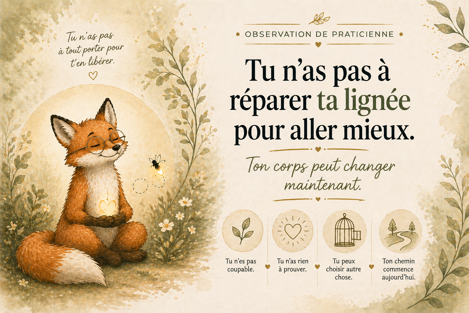 Message apaisant indiquant que l’on n’a pas besoin de réparer sa lignée familiale et que le corps peut évoluer maintenant